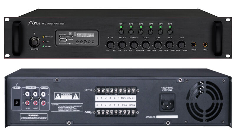 - Amply Aplus AS-6Z60 thích hợp với loa âm trần, loa treo tường, loa cột… trong cùng một hệ thống âm thanh công cộng